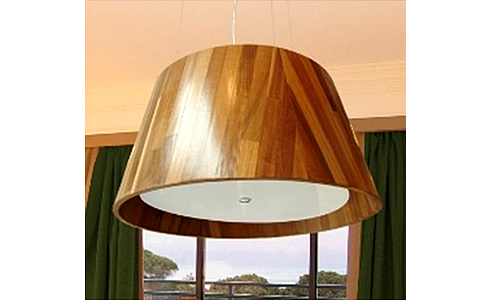 Luminária pendente com corpo em madeira, acabamento em alumínio e acrílico.